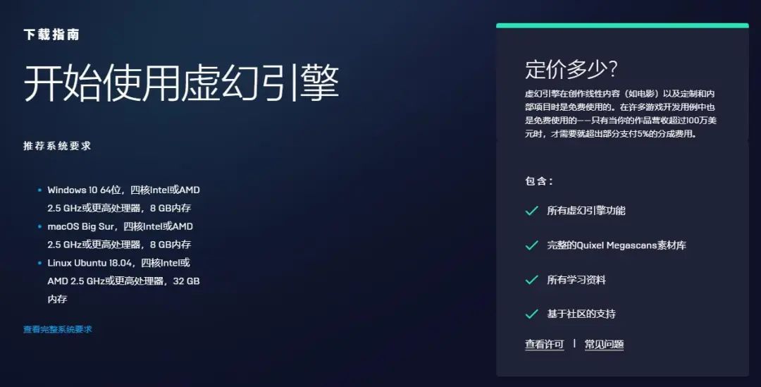 根据官网信息显示,虚幻引擎5的推荐配置分别为:Windows 10 64位,四核Intel或AMD 2.5 GHz或更高处理器,8 GB内存;macOS Big Sur,四核Intel或AMD 2.5 GHz或更高处理器,8 GB内存;Linux Ubuntu 18.04,四核Intel或AMD 2.5 GHz或更高处理器,32 GB内存。而在商业模式层面,UE5与过去基本保持一致。