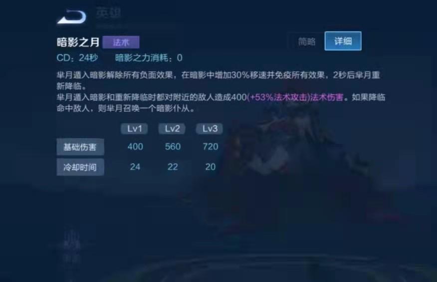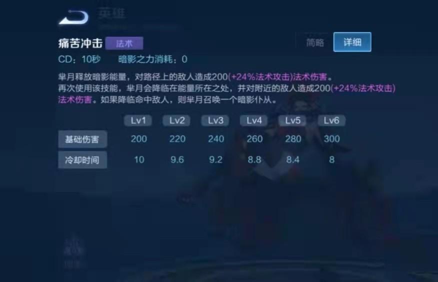 芈月释放暗影能量,对路径上敌人造成一定的法术伤害。当她再次使用该技能,会降临在能量所在之处,并对附近的敌人造成法术伤害。