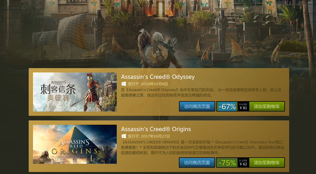 IT之家5月4日消息 在Steam商店,《刺客信条》全系列正在举行特卖活动,促销时间截止至5月5日,其中《Assassin's Creed® Odyssey》(刺客信条奥德赛)直降67%,原价248元,现在仅需81元,史底价格,心动的小伙伴可以入手了。