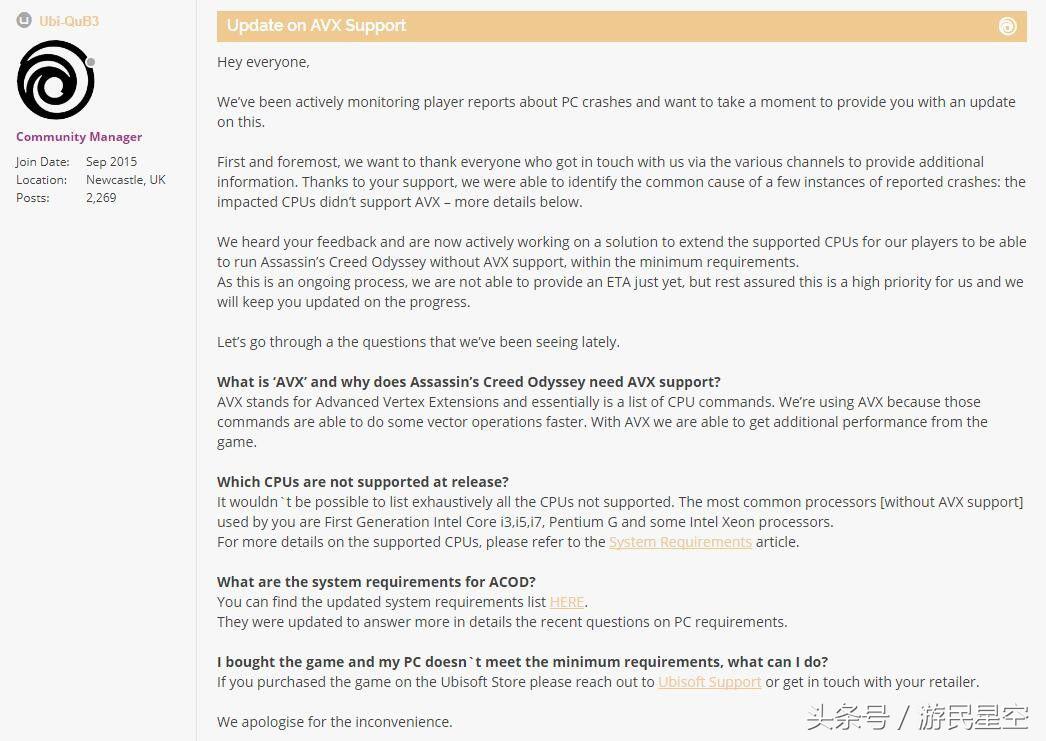最近有不少玩家反映自己的电脑由于CPU不支持AVX指令集,所以无法运行《刺客信条:奥德赛》。对此育碧在官方论坛发表公告称,他们会尽快修复这一问题,让更多的玩家能体验这款游戏。