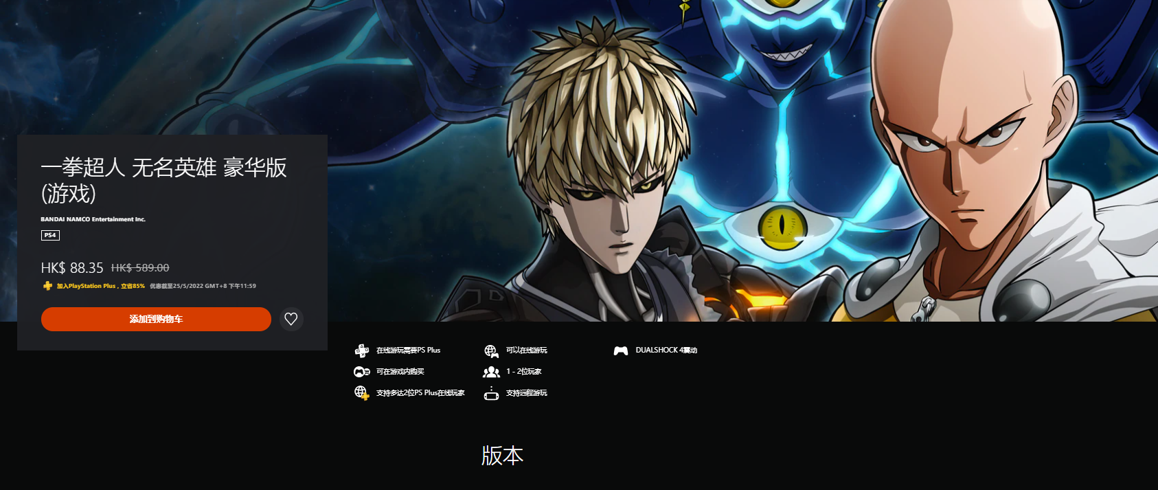 PS4《一拳超人:无名英雄 豪华版》会员15折88.35HK港币