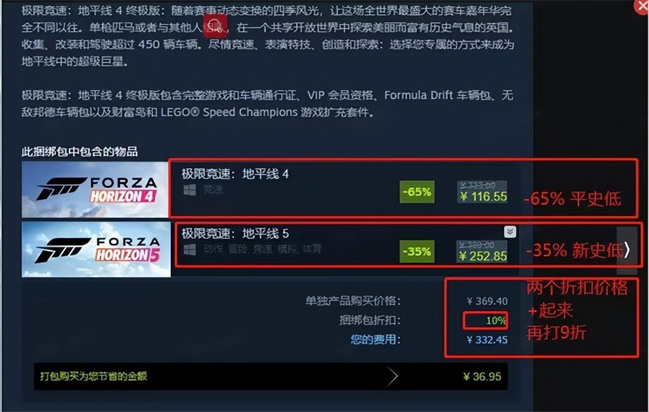 最近Steam的秋季大促已经开始了,对于很多汽车游戏爱好者来说有一个非常不错的消息,那就是《极限竞速:地平线5》加《极限竞速:地平线4》开启了一波联合促销,纷纷达到自己的新史低,并且在这个基础上购买捆绑包的话,还能享受额外的9折优惠,这一波折上折是真的非常爽,可以说是全年入坑最佳时机了。