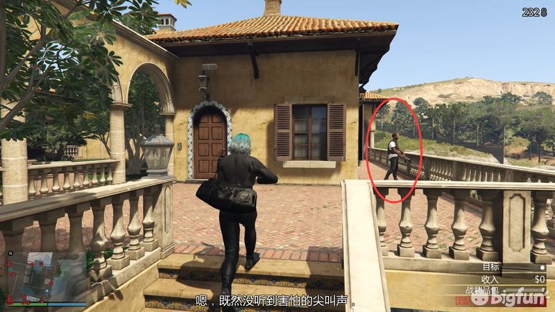 然后往大门方向走,靠左贴着树走,把面前单独的人先打掉。