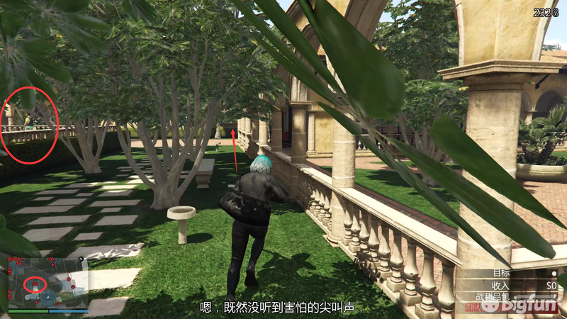 爬一圈,爬到这里等待巡逻的人,注意看小地图,把这个人打掉,或者直接冲上去枪托子敲掉也可以。