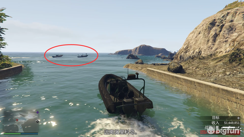 小地图里我们可以开到出海口附近还有个人站岗,其实我们直接开船往外冲就可以,被发现也无所谓,开一小会就结束了,但要是不想被追或者想去机场还是打掉为好。