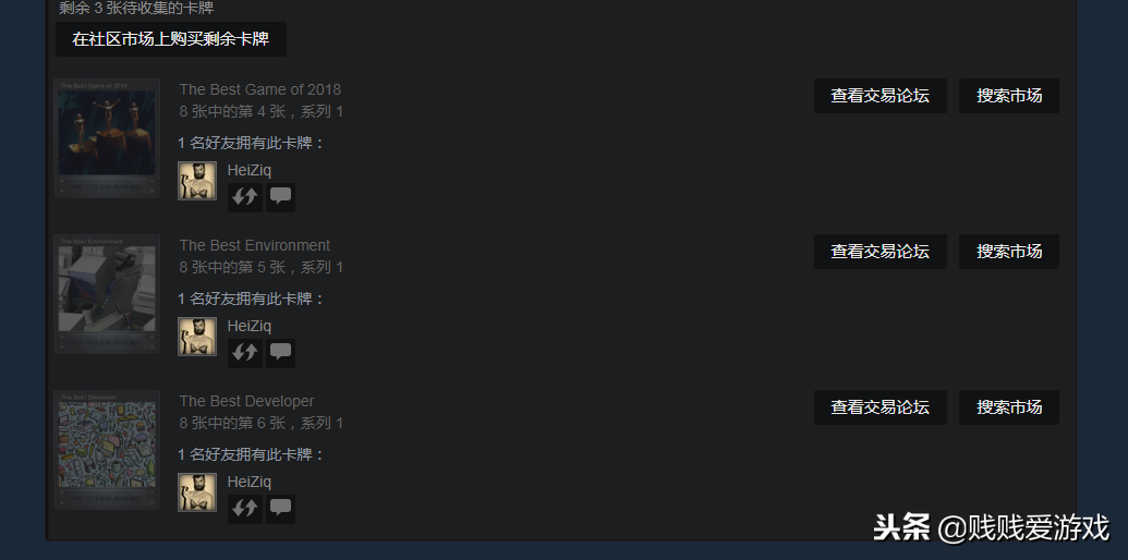 一个小建议:如果不是合卡大佬的话建议只用steam或者HB赠送的游戏来合卡,因为赠送的游戏的卡牌往往价格便宜,大多在0.1元之内,几毛钱就可以合卡升级,非常合算!