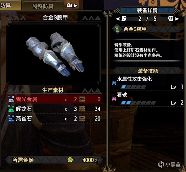 合金S手,水属性+1,水属性伤害+2,看破+2,10%会心率,材料好弄,都是采矿,雪光金属可以选择去雪地采集。主要还是为了提高会心率收益。