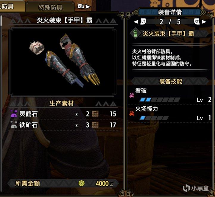 炎火手,看破+2,10%会心率,火场怪力+1,体力在35%以下,防御力+50,制作可以选择材料+钱/钱,前期可以预防下喝药被小招秒了。主要还是会心率的收益提升。
