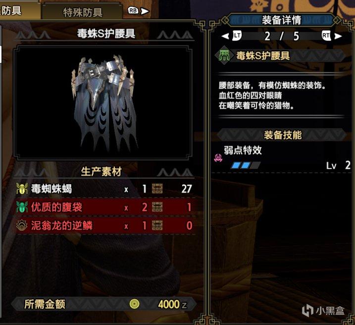 毒蛛S腰,弱点特效+2,有效部位会心率+30%,可以选择配合雷狼龙的一个部位组成最终形态。