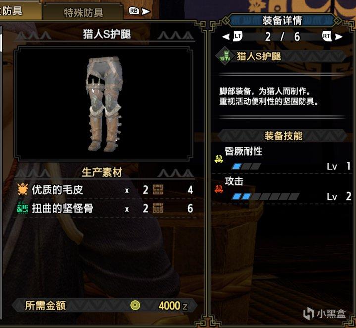 猎人S脚,昏厥耐性+1,昏厥时长减少60%,攻击+2,伤害收益提升明显。前期材料也较好出,优质的毛皮可去上位各大地图寻找雪鹿或精灵鹿获取。