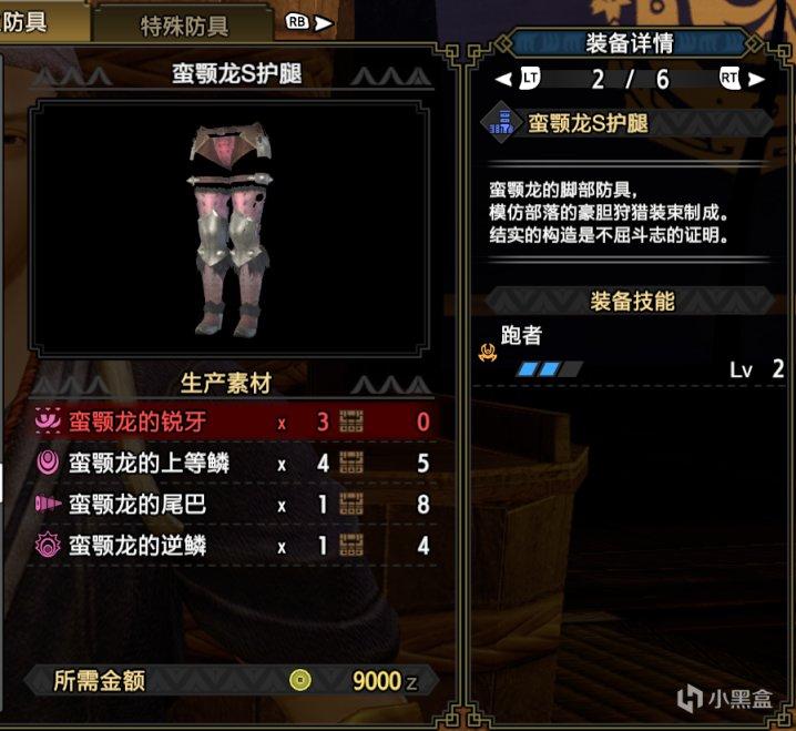 蛮颚龙S脚,跑者+2,持续耐耗减少30%,续航必备。配合同属性其他部件效果更佳。