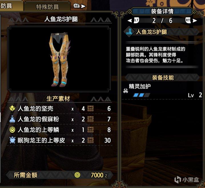 人鱼龙S脚,精灵加护+2,发动效果30%伤害减免。贪生怕死流,与之前部位套件看情况搭配。