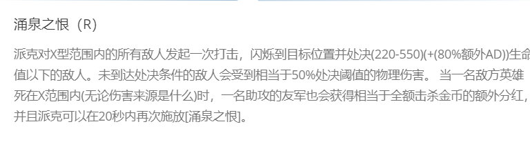 派克的R技能是团战收割神器,进行团战时候,派克可以在边缘ob,留着R来收割人头(不要怕K头被喷,用R击杀英雄所有参与助攻的英雄都可以获得赏金。)R斩杀之后可以用E技能脱离团战,等待下一个E技能,再次斩杀对方从而实现“杀人白刃里,脱身红尘中”