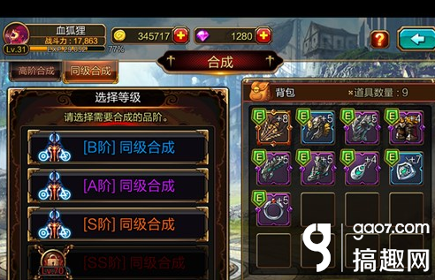 同级合成装备,可以获得同级装备,成功率100%。我们使用传说S阶装备合成时,还能获得隐藏装备哦!