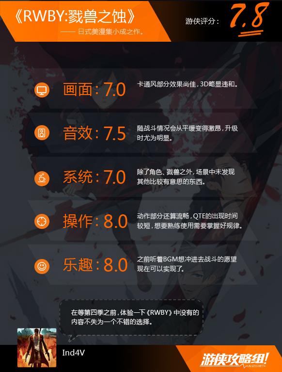 通关之后决定将乐趣一项的分数降至7.0(未包含和小伙伴开黑的情况),系统/剧情一项的分数降至6.0,总分降至6.9(单项评分不会直接影响总体评价),原因在于游戏中的内容过少,除了主角其他人都活在通讯器之中。大部分时间要做的只是跑图与杀怪之间的循环最多加了找钥匙再开门的桥段,仅在第四章节中出现了一个给装有炸弹的矿车添加燃料的小任务。游戏的中最终boss是早在第一季动漫末尾出现的蝎子戮兽,然后换了一个配色而已。人物满级只有十级,同时部分技能的解锁条件有些苛刻。而作为一个号称有着新剧情的漫改游戏作品,游戏中的剧情穿插全部通过一个通讯器完成,未免显得有些单调。
