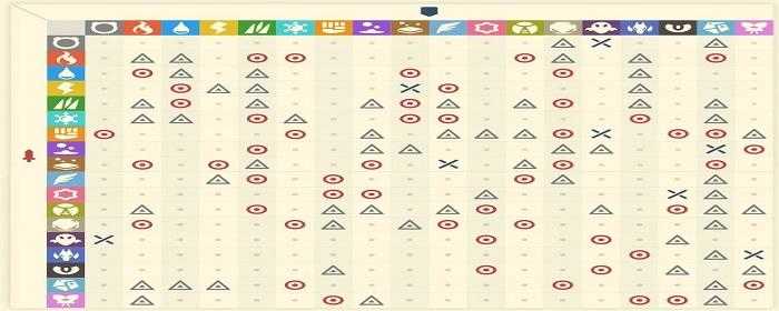 红色圆圈表示效果极佳(伤害增加),灰色三角表示效果不好(伤害减少),小点为正常伤害,x为免疫(不造成伤害)。