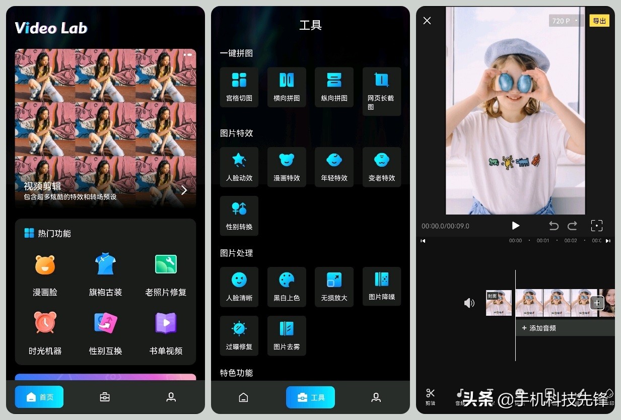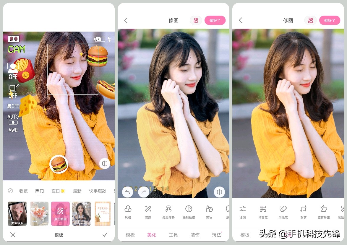同样它也是支持很多修图模板、修图工具、以及美颜美化工具,也支持拼图、照片变视频等功能。