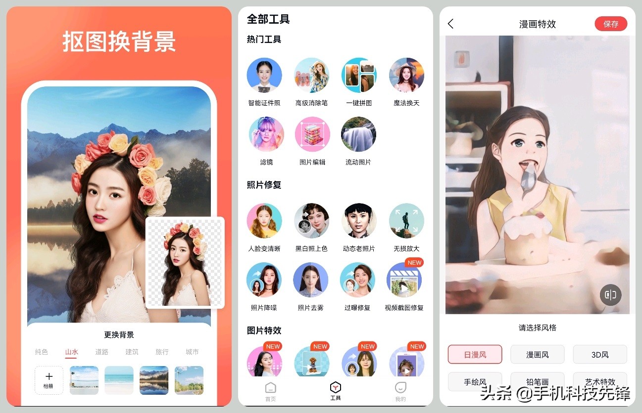 除抠图外,基本的美颜、滤镜、裁剪、画笔、调色、文字等功能都支持,还有一些图片特效能使用,当然还有漫画风格的图片。