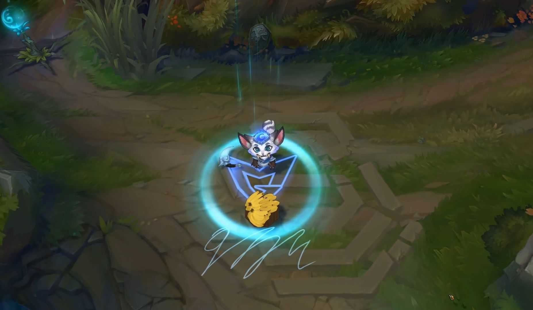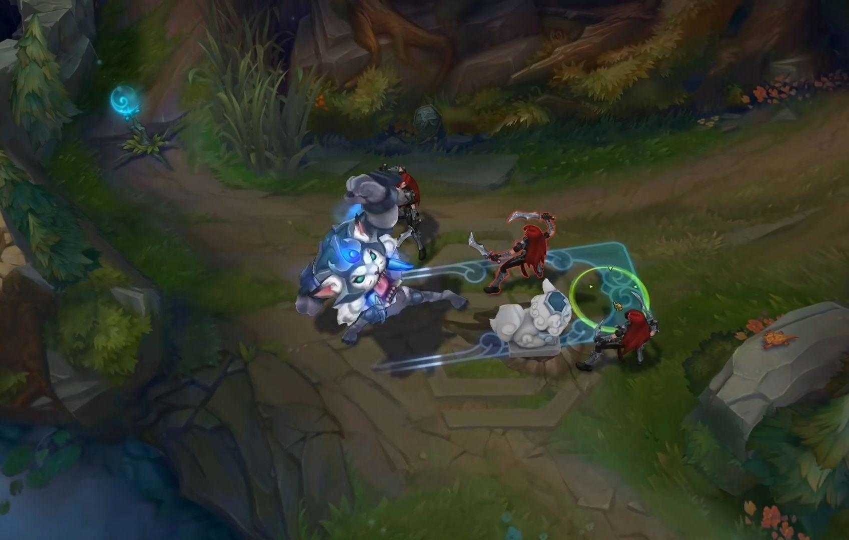 技能特效上,小纳尔丢出的是带有祥云图案的蓝色回旋镖,三环被动也有祥云标志,变大后的特效比较好,q技能扔出一座石狮子,w技能同样祥云的图案。
