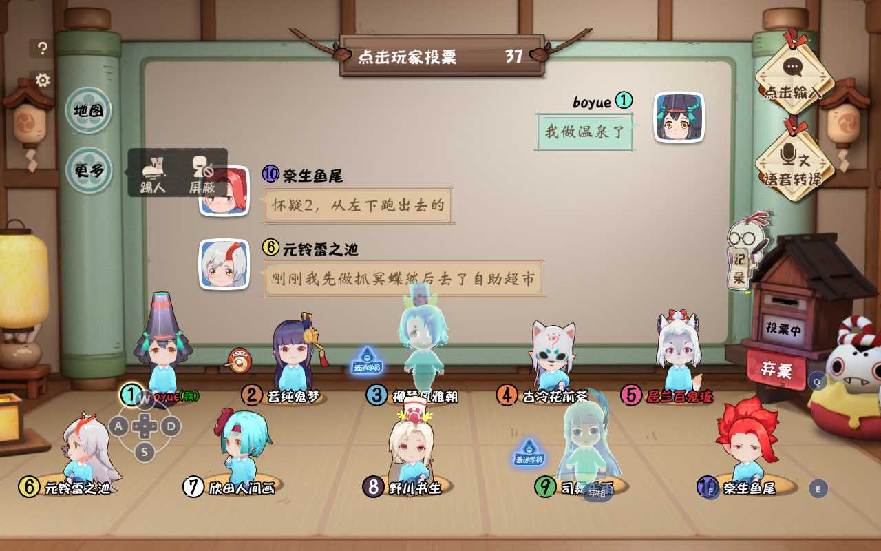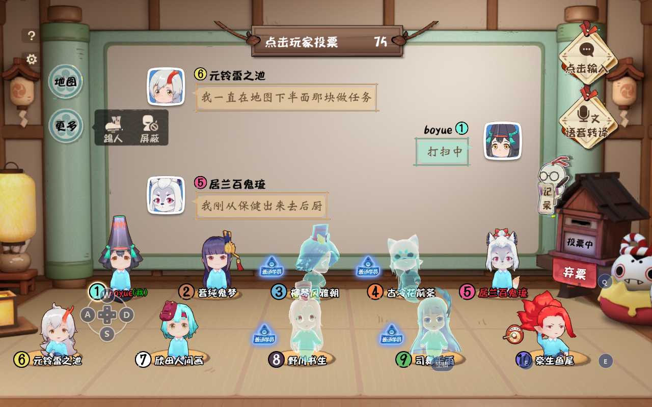 在讨论环节这边可以主动汇报自己的位置,风纪委员可以伪装,接着所有未被封印的学员与风纪委员都可以语音或者文字输入来讨论前面自己做了什么看见谁等等,一些老手甚至可以用反向输出的办法来解除队友的嫌疑,这边boyue做风纪委员时另一名就故意怀疑我刚刚在做啥。