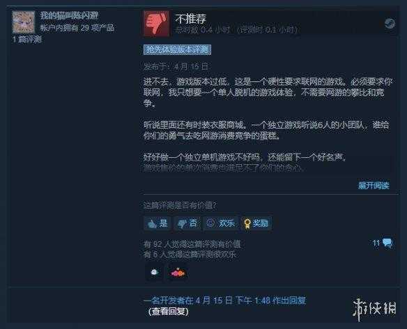 该作是由一个6人团队开发制作,耗时两年,官方一直在发实机和各种宣传片,吸引了不少玩家关注,不过目前该作的初期评价并不高,已经购买的玩家中仅有34%的玩家给了好评。