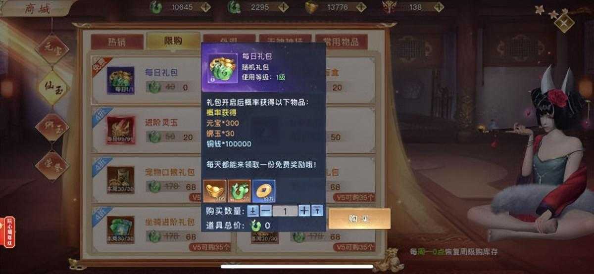 2、交易行上架玩家在游戏内获取到的非绑定道具都可在交易行进行交易出售~获取的元宝会扣除10%的手续费,每日通过交易能有一笔不少的丰收3、商城获取福利放送,每天都可到商城领取一份免费礼包奖励
