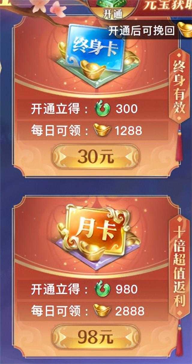 4、礼包购买想要获取更多元宝的玩家,可以在游戏内购买相关的礼包①终生卡和月卡每天上线都可领取元宝噢