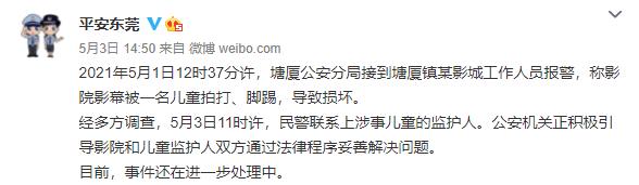 昨天(3日),东莞警方最新通报,民警已联系上涉事儿童的监护人。公安机关正积极引导影院和儿童监护人双方通过法律程序妥善解决问题。目前,事件还在进一步处理中。