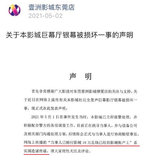 据悉,这块银幕本身价值就高达40万,从海外引进到中国的运输费用约为40万到60万左右。换言之,这块巨幕价值高达80万到100万,还不算搭建、人工等这些费用。虽然影院第一时间更换荧幕,但仍花费两到三个月的时间,影院当时的停业损失最少也在百万以上。