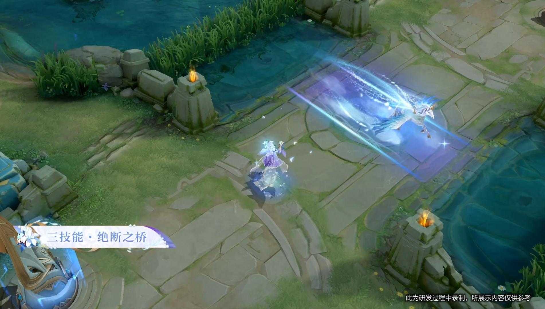 一技能是大乔的,一个控制技能,同时也是加速技能,技能特效融入了白纱和青鸟元素,感觉就像铺地毯一样,前面有两只小鸟,使用了白色网纱的拖尾特效。