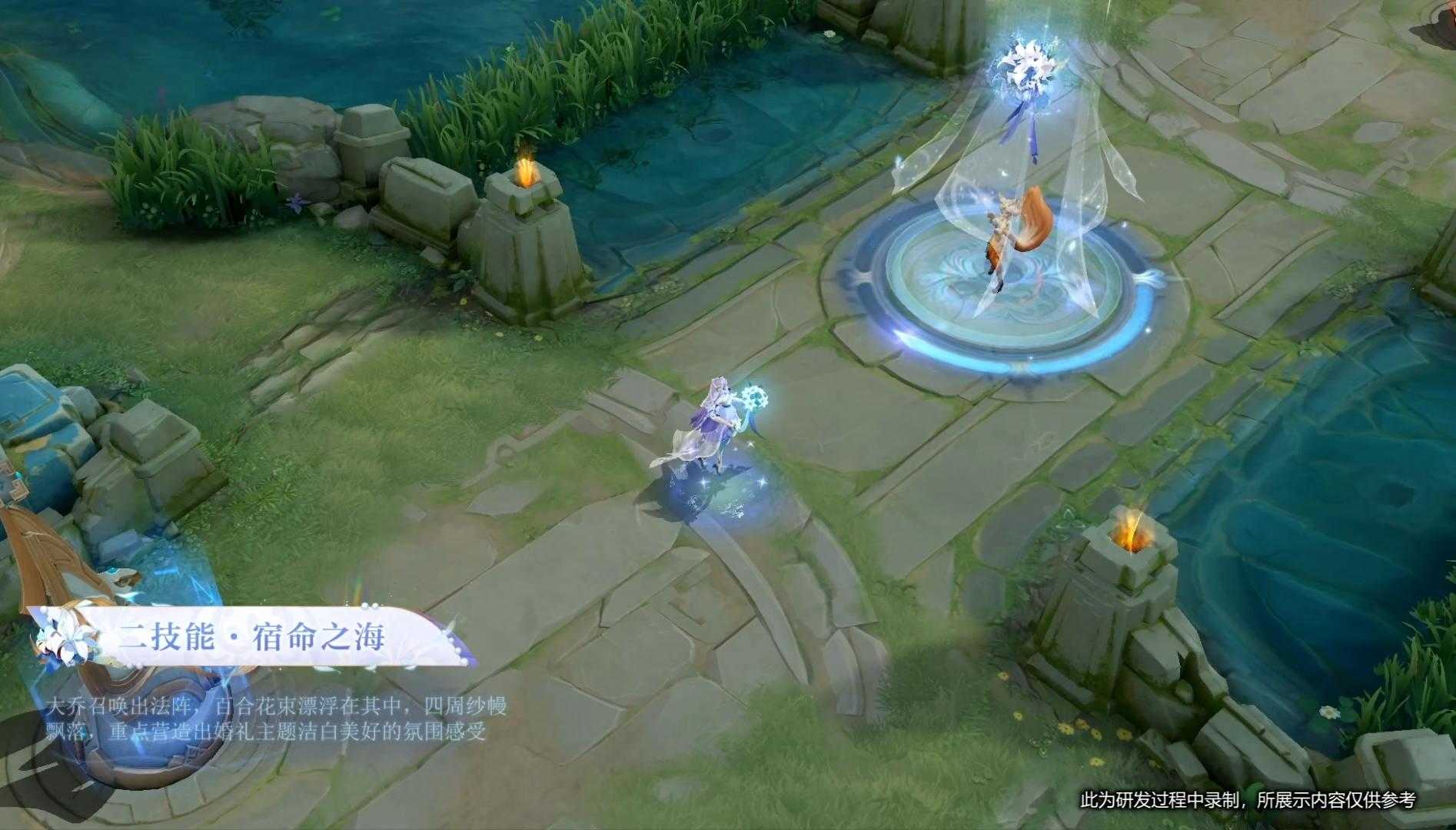 二技能在地面上留下一个圈圈,倒计时效果非常明显,在头顶还会出现一束百合花,同时还有一些白色网纱效果。