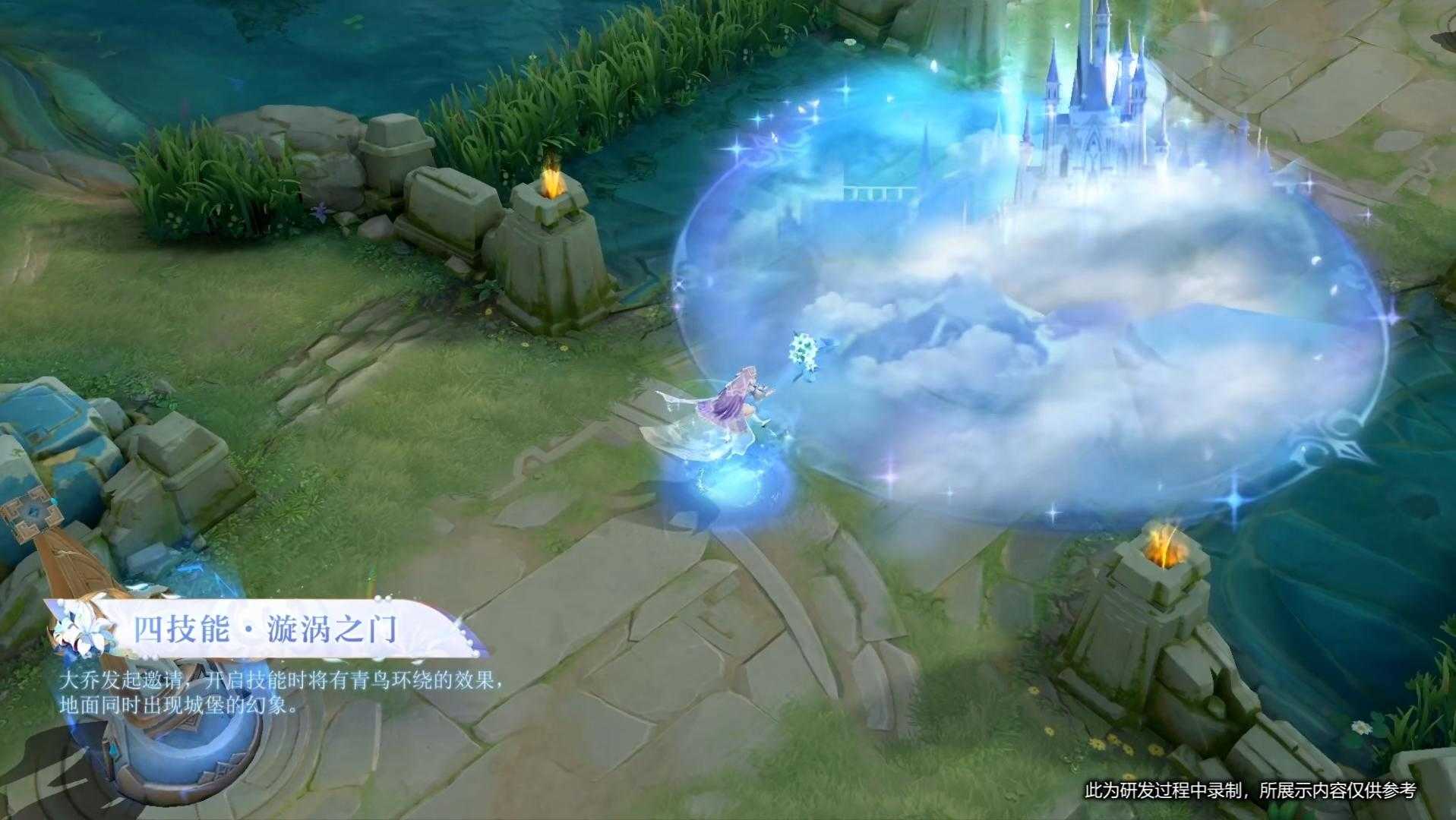 大招特效在开启时会出现青鸟环绕,然后地面上会出现城堡的幻象,不过这个城堡很快就会消失,大概只有一秒钟左右的时间。