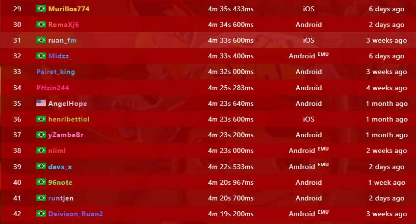 异常的不仅是游戏本身的热度。打开如今的竞速榜单,投稿玩家清一色的绿色国旗,向全球的挑战者共享了一条信息:巴西人民真的很喜欢《地铁跑酷》。