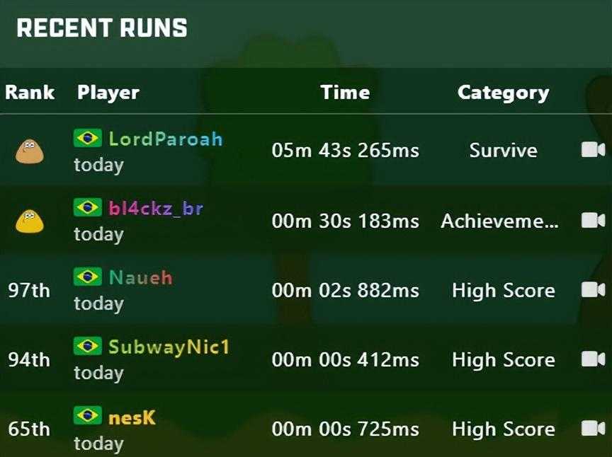 就跟发生在《地铁跑酷》身上的故事差不多,《我的宠物Pou》的速通玩法也是在多位视频主的影响下开始在多地普及,榜单常客通常是西班牙、以色列这些大家不甚了解的国度。到了最近,不满足于在轨道上狂奔的巴西朋友们也盯上了这款游戏,开始用实力冲击排名。