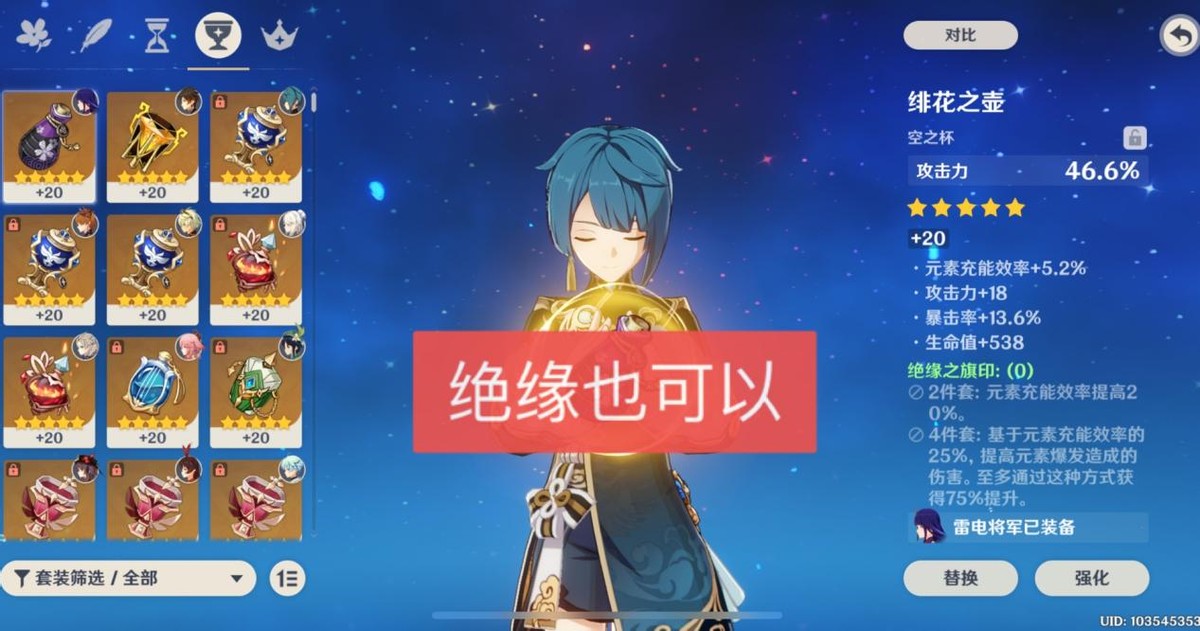 理由有二,第一,绝缘两件套效果是提高元素充能,行秋作为阵容中需要循环开大的角色,充能很关键,因此武器方面选择祭礼剑/腐殖之剑就是提高元素充能,因此绝缘直接增加元素充能,正好契合行秋的输出手法。第二是绝缘四件套的效果,根据行秋的元素充能提高大招的伤害,使得其高倍率的大招伤害上限进一步提高,再加上雷神、神子等主C都能用绝缘套,给行秋一套边角料也是轻轻松松的。