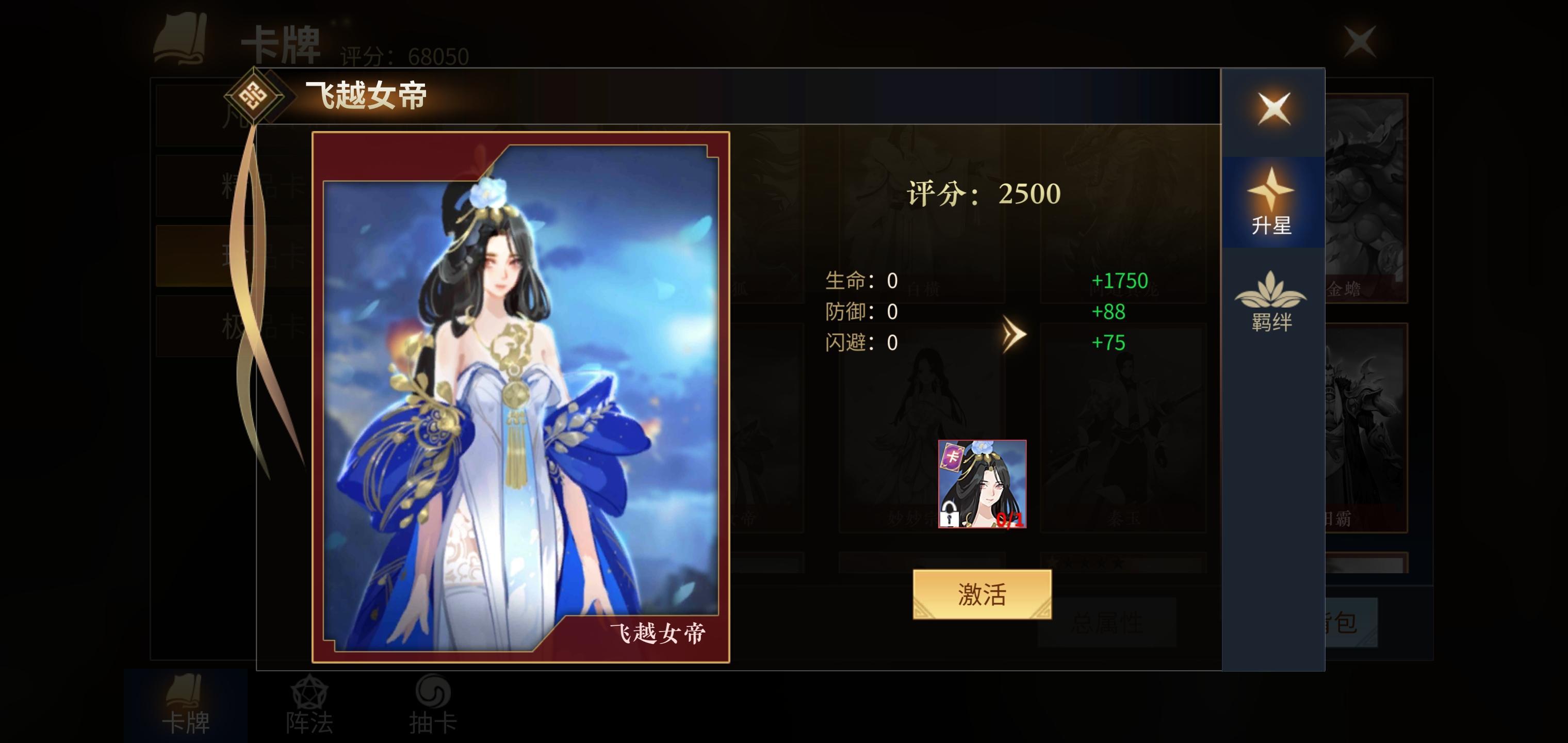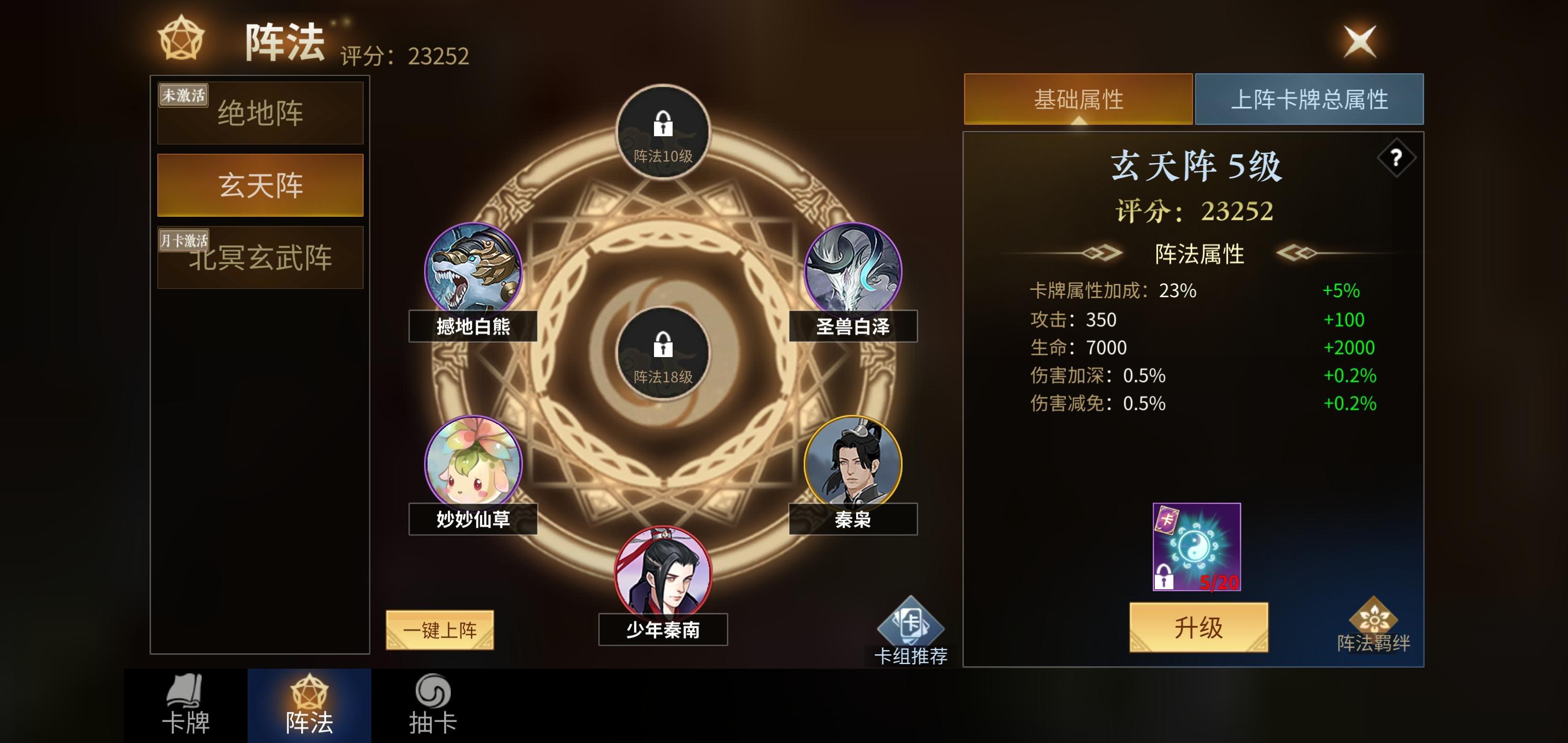 想要激发卡牌真正的力量,需要通过搭配不同卡牌激活阵法后,卡牌相应的属性才会生效。阵法会相应的一定比例继承当前已上阵卡牌的属性,上阵卡牌属性越强,继承到的属性也越强。玩家可以同时激活多个阵法,不需要纠结选择。并通过培养,可以提升阵法等级,阵法等级越高,对自身能力的加成越强。