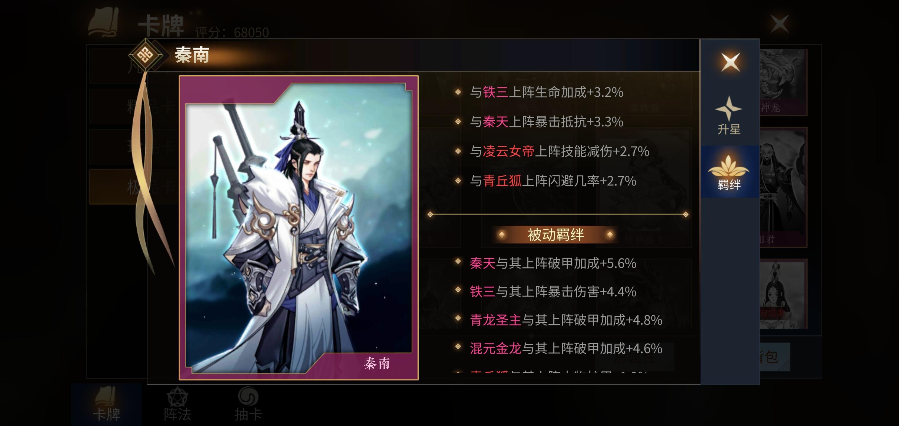 小说人物间的恩怨情仇在游戏里透过卡牌的羁绊可以略窥一斑,相性契合的卡牌组合上阵,会激活更多的属性加成。所以玩家在组成卡牌阵法时,需要斟酌一下,随意拼凑而成的阵法效果可能会不尽人意的。