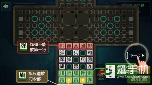 在进行四国军棋游戏之前会提示玩家进行布局,即将25枚棋子分别摆放在自己范围内的23个兵站和两个大本营中,炸弹不能放在一线,地雷只能放在最后两线,军棋只能放在大本营。这个布局将会作为玩家的开局阵型使用。同时玩家也可以通过调入布局将预设好的布局调入。