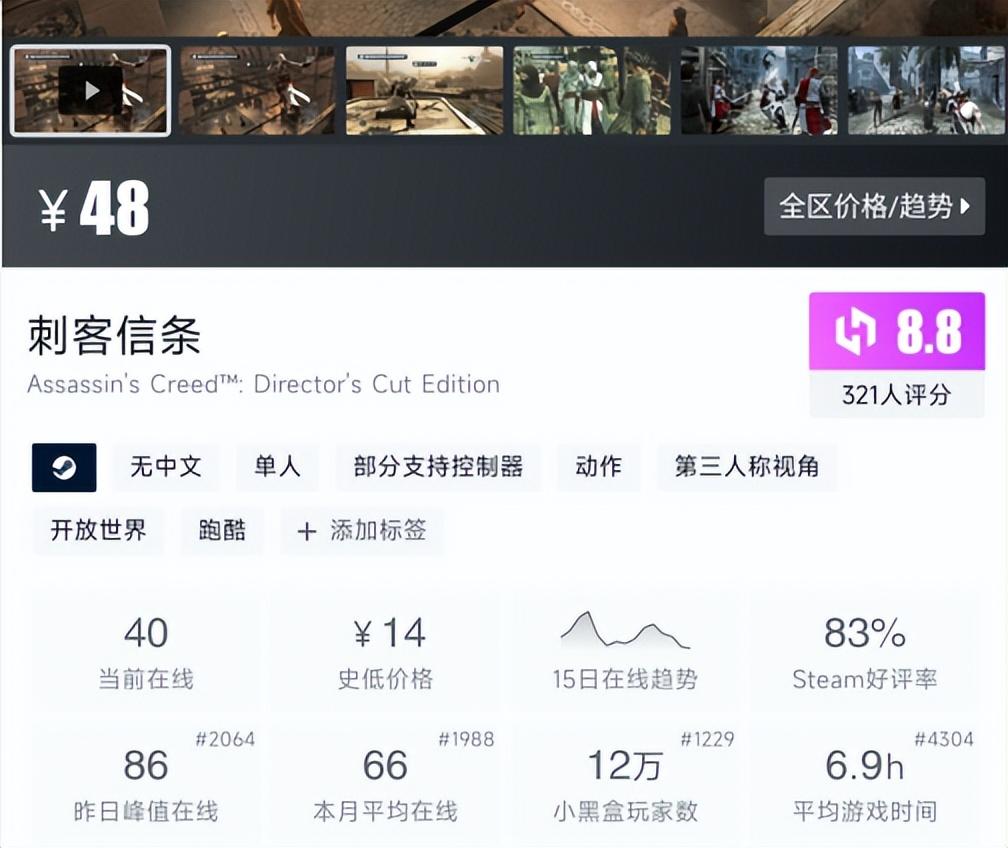 然而Steam上,AC1的好评率还是达到了83%,这可不仅因为刺客信条1卖的便宜+出的早,必然还会有其他原因。