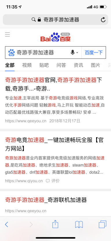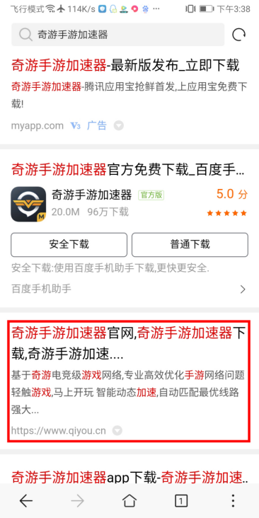 ①用手机自带的浏览器,进入百度,搜“奇游手游加速器”,找到下图所示的官网,不要直接下弹出的奇游APK,也不要用其他搜索引擎,很容易下错版本,导致下载的奇游没有游戏下载功能。