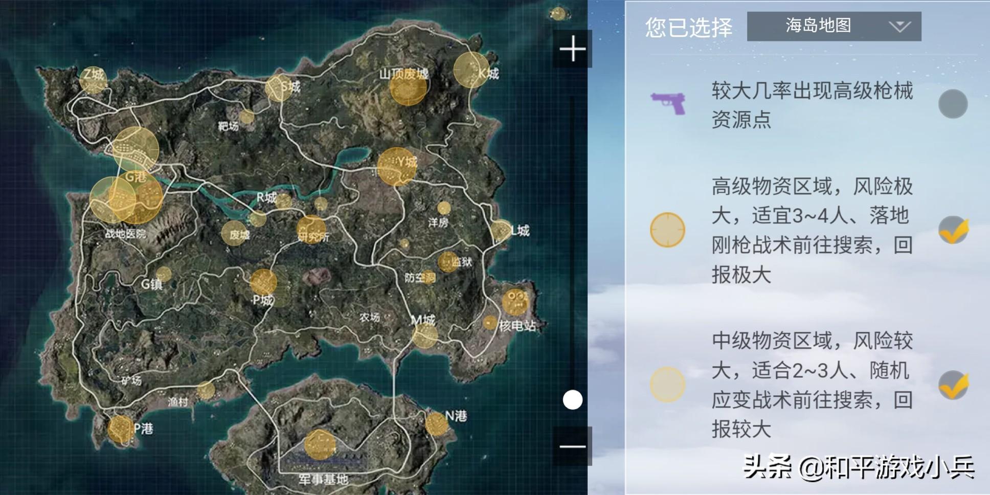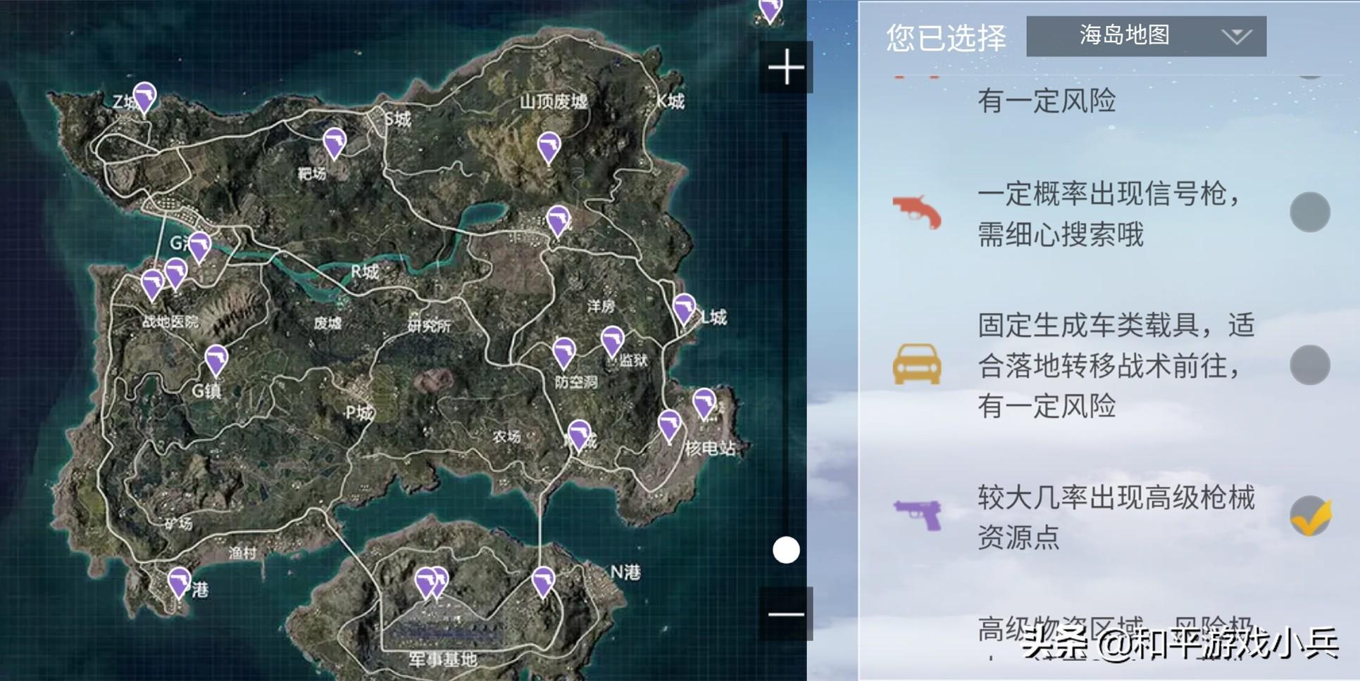 高级枪械点,应该是能高几率刷出M416、98K或M24之类好东西的地点。相比起刚刚提及的资源点高中低之分,武器分布要友善一点,一些资源不多的区域例如G镇、P港、Z城之流都能刷出高级装备来。令人大跌眼镜的是超级热门资源点P城原来没啥好货,另外靶场也是高级枪械刷出点,看来针对可以去碰一下运气。另外远来大陆的出生岛原来也是个好地方,难怪那么多出生岛游览团了。