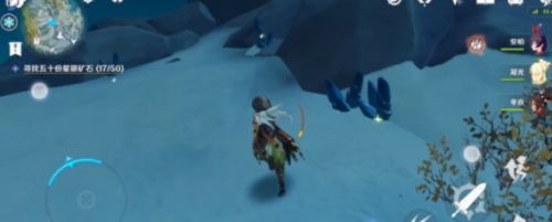 第二处则需要沿着山脚往左边方向走,当看到一个冰霜丘丘人法师的时候,往上到山壁交接的地方,就可以找到四个矿石,打碎可以拿到4块左右。