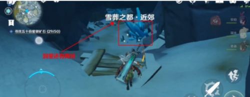 玩家传送到雪葬之都·近郊比较下面的那个传送点后,往左边方向走找到有水晶簇的山洞,洞口处就有一处矿点,全收下能拿到3块左右;再往洞里走还有两块矿石,可以再拿到2块星银矿石。
