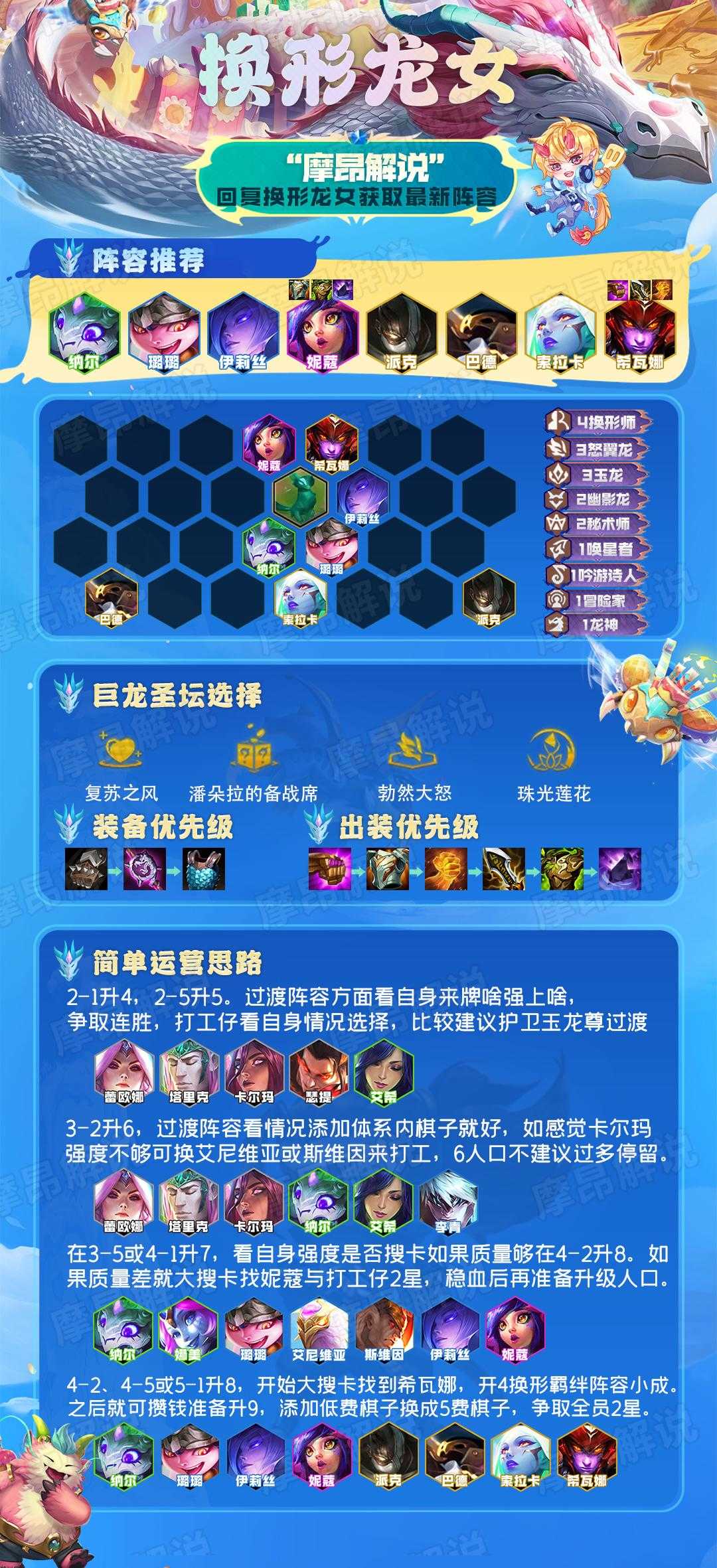 很多朋友说这版本太不平衡,索尔强度太高,但其实不是这样这版本还有一个隐藏的“大佬”那就是希瓦娜,阵容成型可乱杀。今天摩昂就把这套阵容的运营思路与大家分享——换形龙女。