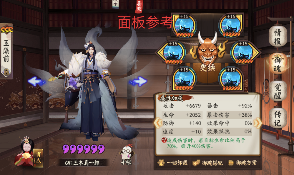 这套配置还有一个注意的地方就是输出式神的卡速问题,相差速度要大于3点,防止被小怪减速后超车的情况出现,还有就是注意玉藻前的爆伤需要是全队最高的,这样的配置就不担心丑女下咒的问题了,基本上是可以稳收的,这套阵容也是日轮之陨通关速度最快的阵容。