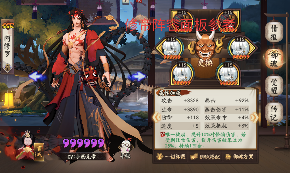 这套阵容相比较玉茨阵容比较容易做出来,一方面是不担心丑女下咒的问题,由于输出只有阿修罗一个,不需要卡输出式神的面板和速度,给阿修罗带全家最好的高攻狂荒套装即可,虽说通关时间要多两秒,但是要更稳定一点,这套阵容也是更推荐大家使用的一套阵容。