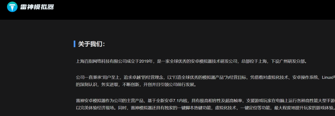 听名字就知道和雷电模拟器脱离不了关系。那么这两个软件到底有什么关系呢,从雷神模拟器的官网可以看到,软件公司来自上海百指网络科技。