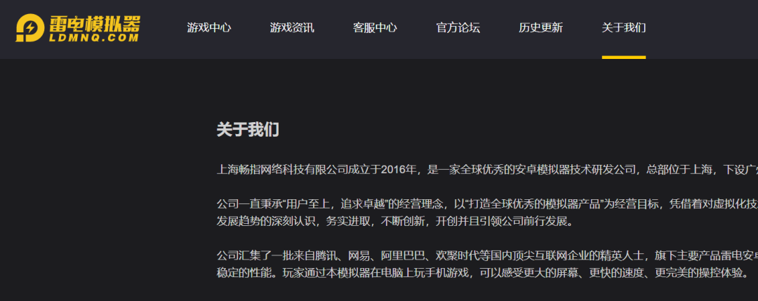 而雷电模拟器官网的关于里面,显示软件开发者为上海畅指网络科技,两家公司介绍一模一样,且一字不差。