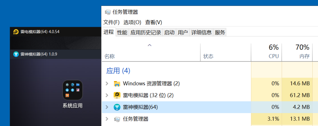 内存占用上,同样都是64位的版本,启动软件,在没有开启任何应用的情况下,雷电模拟器占用61M内存,雷神模拟器占用4.2M,优势明显。