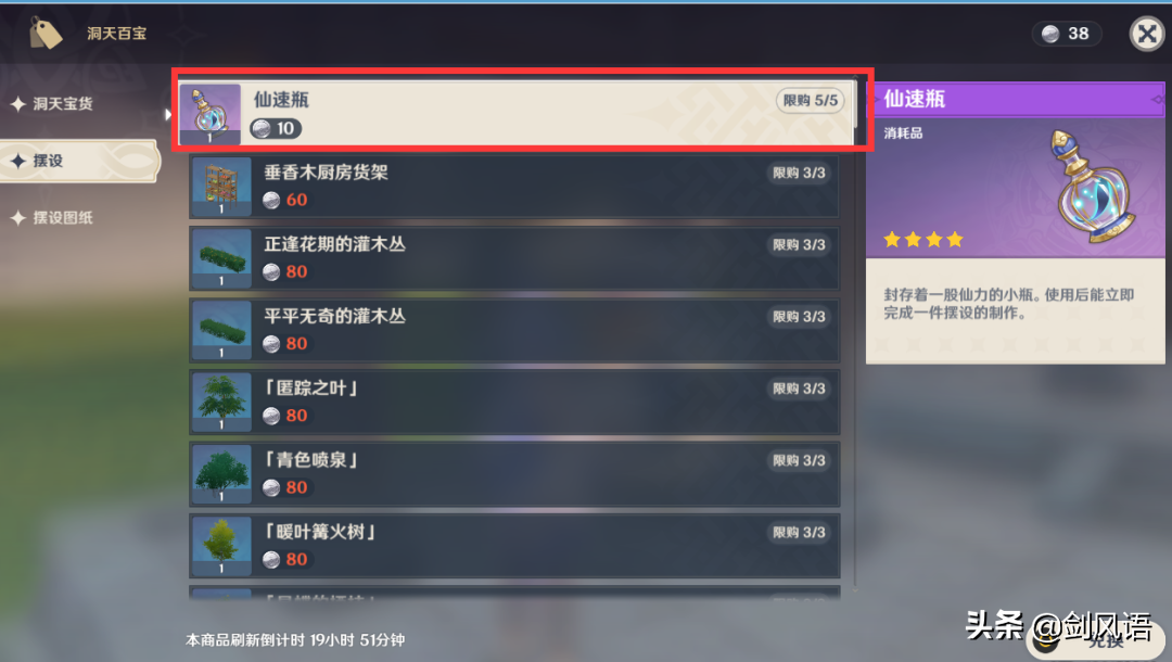 1.在摆设选项处,购买仙速瓶,使用仙速瓶可以立即完成制作摆设。省去了等待制作时间,24小时刷新5瓶。